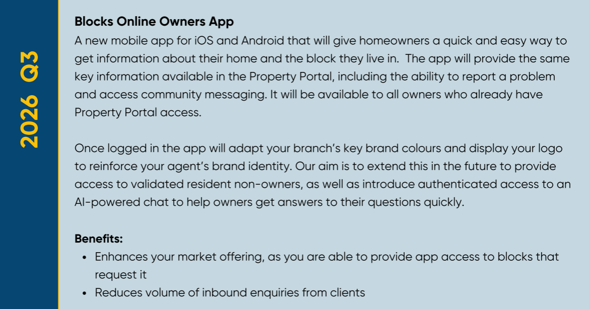 We’re continually developing Blocks Online to help Property Managers and Agents work more efficiently, stay organised, and remain fully compliant with the changing regulations in the industry.