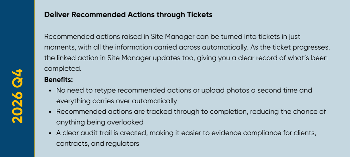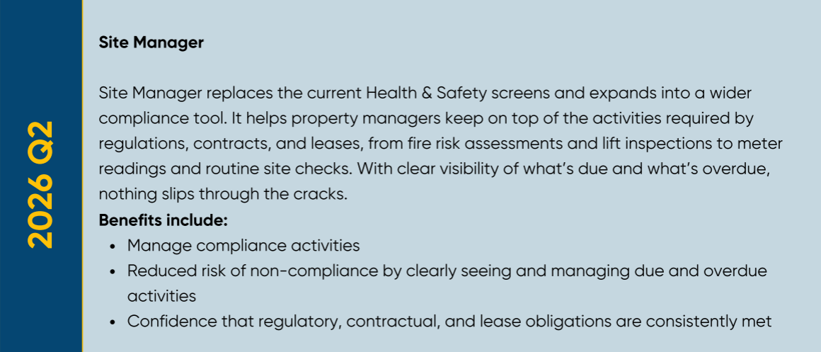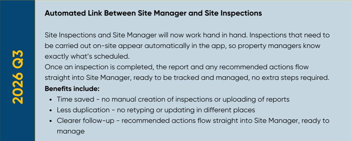 This roadmap gives you a preview of what’s coming next, from mobile tools that cut down on time and admin to new features that make compliance and reporting more straightforward. Every update or new product is designed to save time, reduce risk, and give you greater confidence in meeting your responsibilities. Due to the evolving nature of development, expected timelines may be subject to change.