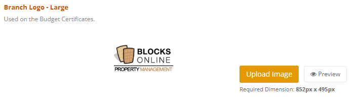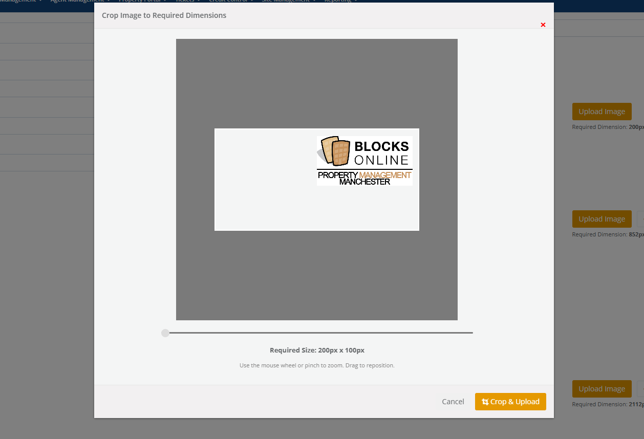If you click on Upload Image, you will be presented with a pop up modal that allows you to upload and re-size the image to the correct dimension based on each image type.