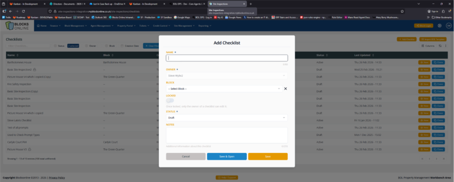 Once you click on ‘Save’ you will be taken back to the list screen where the new Checklist will appear, or if you click ‘Save& Open’ it will display the Checklist Details screen allowing you to edit the contents of the checklist.