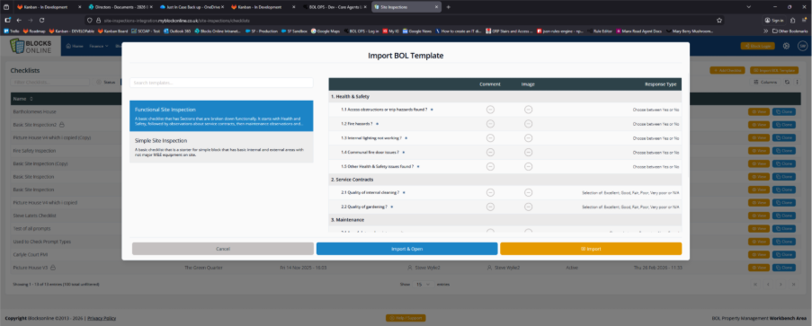 Click on the ‘Import BOL Template’ button to import a starter Checklist from BOL. The system shows you a list of potential Checklists that you can select from. These are good starters when initially using the Site Inspection Tool.