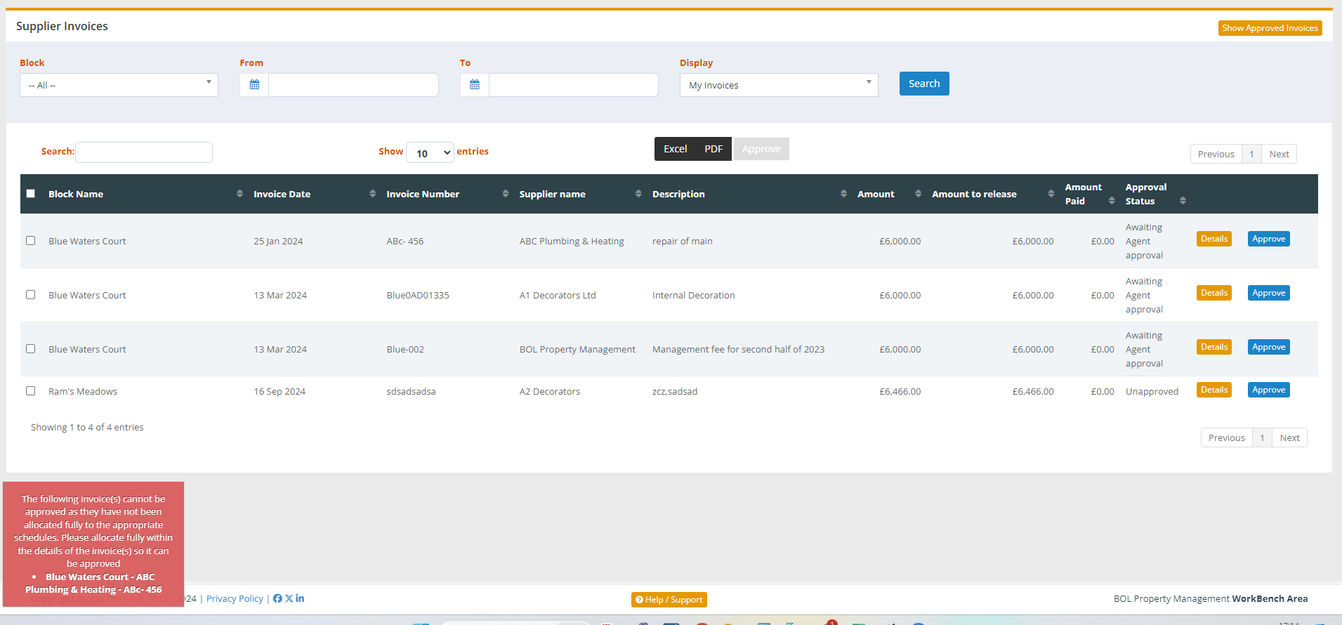 If you have chosen multiple invoices to approve and they are not fully allocated to the block schedules then a pop up alert is shown of the invoices that cannot be approved: