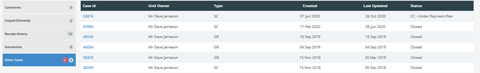 Each credit control case has a unique system created reference number which is displayed at the top of the case details pop-up screen along with the owner name, unit number and block name.