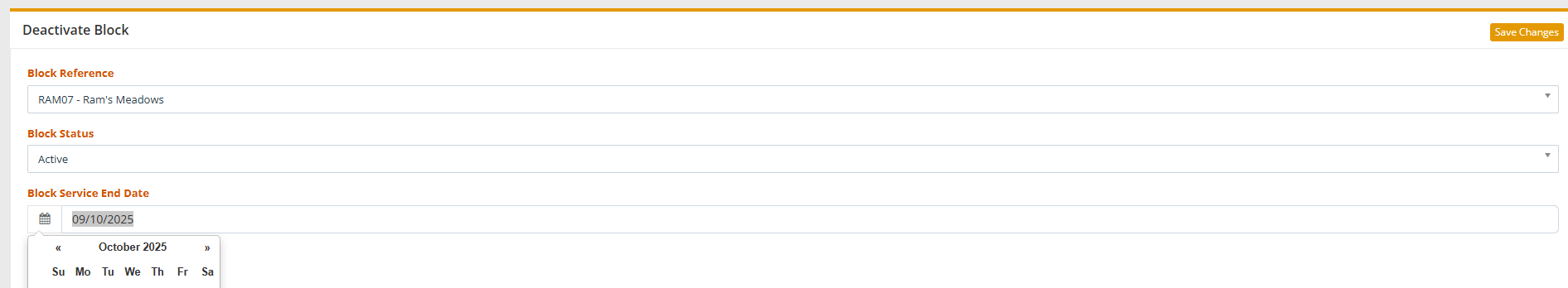 ALERT: When setting the status back to 'Active' for a 'Deactivated' block, do remember to clear the  Block Service End Date field. If you don't, then the system will keep that block as active up to and including the date set in that field.