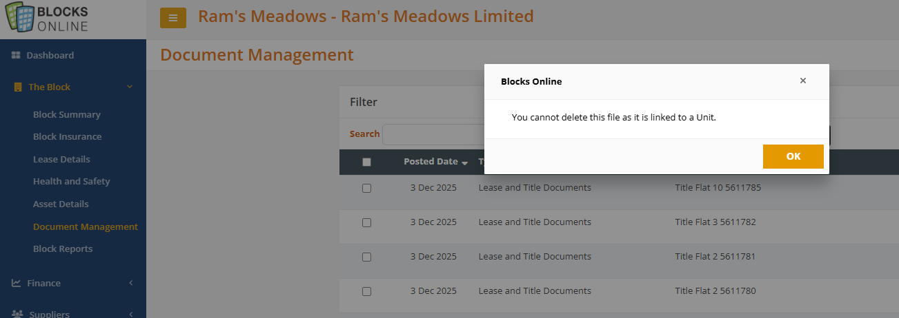 Title documents uploaded via the Unit Details screen are visible here but you cannot delete them from this screen. If you try to, then you get warning message: