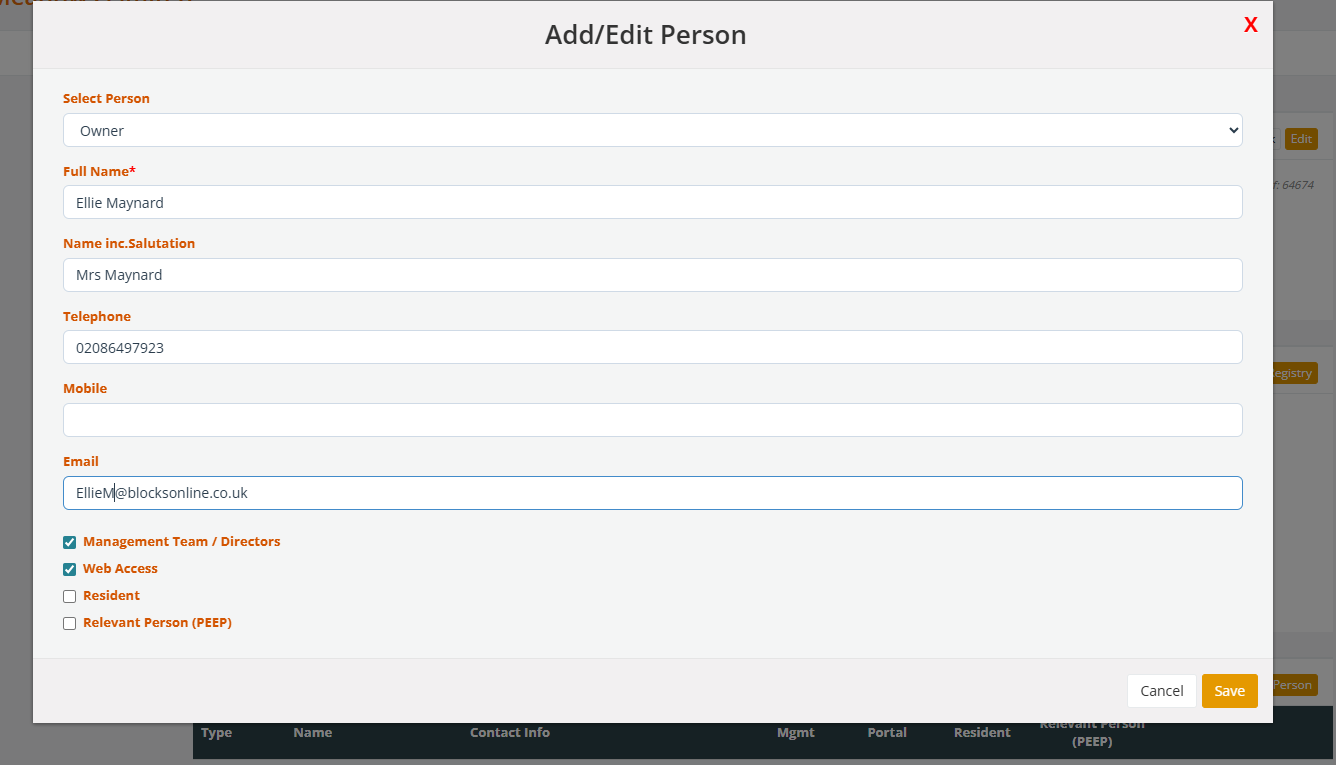 This lists all the people involved records that had the option ticked when they were created. It gives a clear indication of the contact points for the property manager to help manage the block more efficiently.