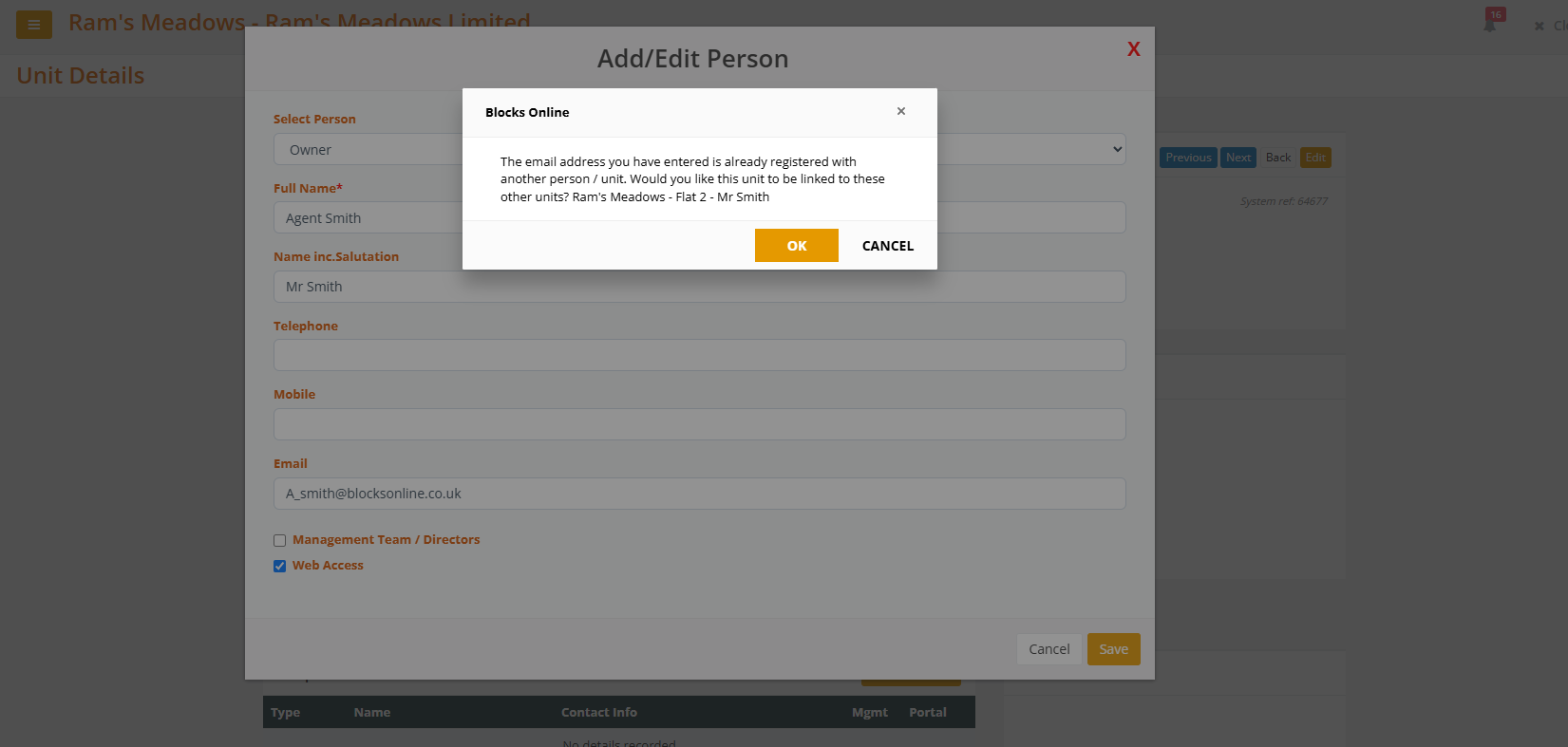 If an email address already exists in the system for another unit in the same block or a different block, then you will receive an alert which links the units together: