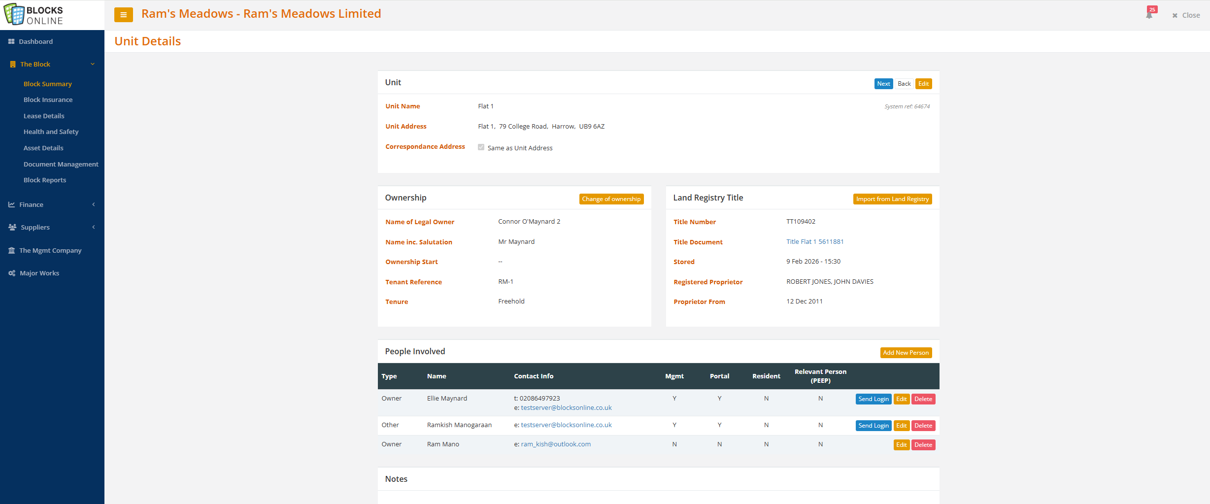 Correspondence Address - The address that is required to post any correspondence to the unit. Often this is the same as the unit address and in those situations, you can just tick the 'Same as Unit Address'. When you do this, the Correspondence Address lines disappear (If you don't have this option ticked but Line 1, Line 2, Line 3, Town, Postcode are the same on both address sections then it has the same effect).