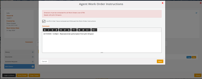 So now where a Block has got an Agent Work Order Instruction created against it then when you create a ‘New Work Order’ on the Ticket screen a pop-up window will appear with the instruction details highlighted in red: