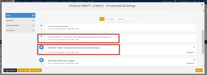 Once the Work Order has been created and sent, then in the ‘History’ menu of the Ticket screen a record of both the user confirmation and the text put in the Comment box from the Agent Work Order Instruction will appear: